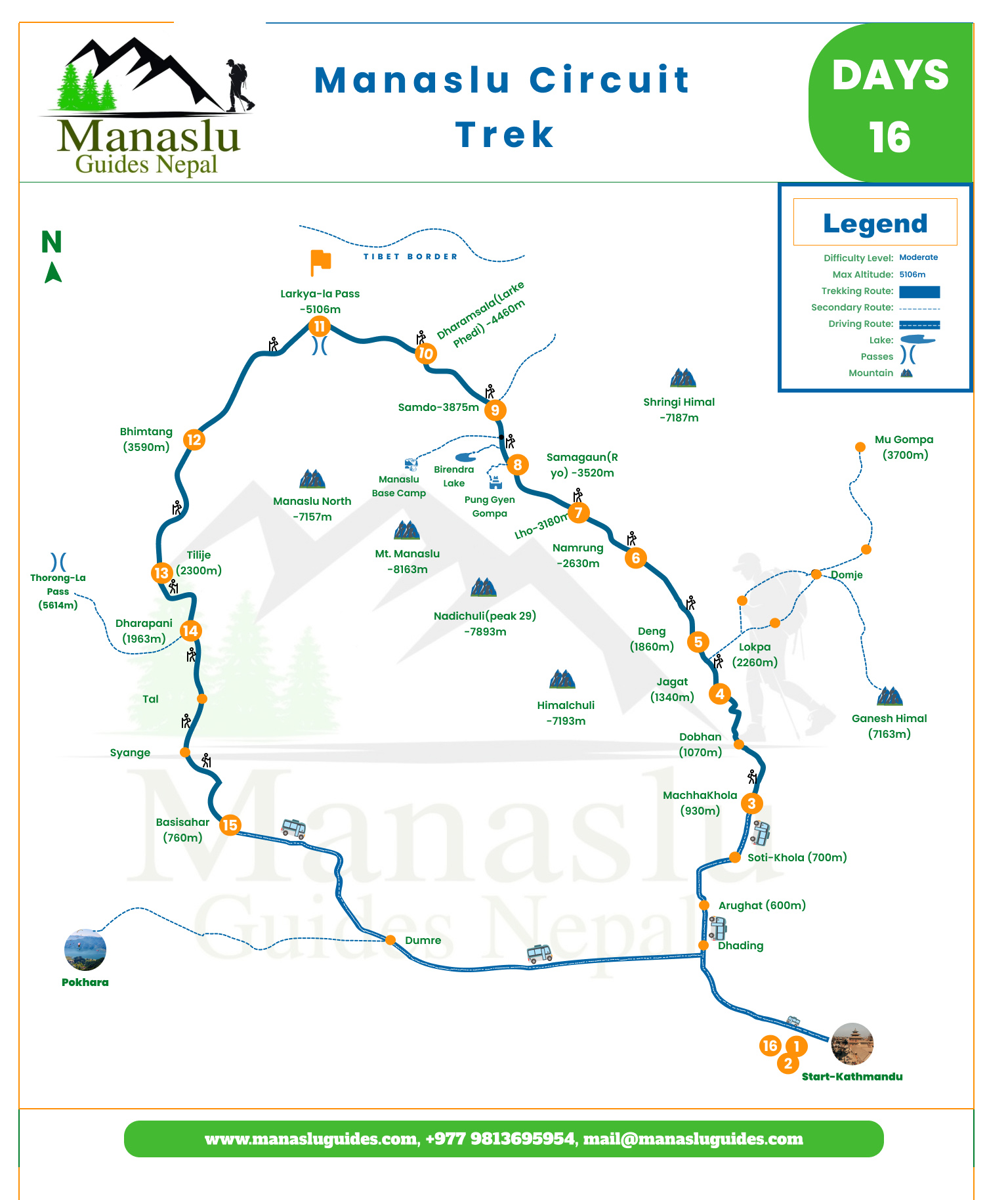 The Manaslu Circuit Trek is designed for trekkers with good physical fitness. It lasts about 16 days and involves 5 to 8 hours of walking each day on rugged, steep, and rocky trails, including high mountain passes like Lark La (5,160m).